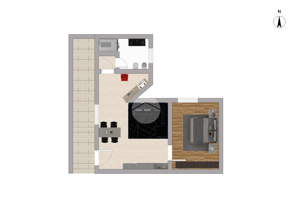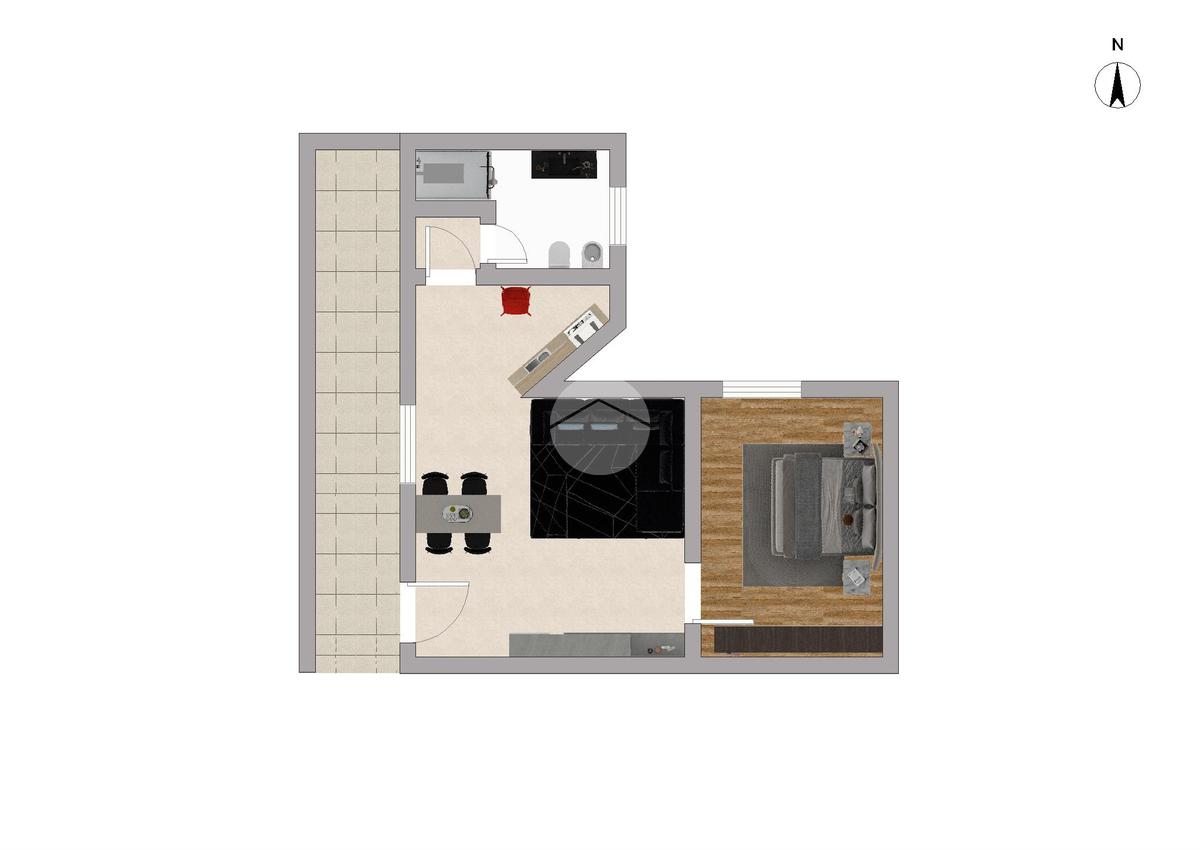 Luminoso soggiorno, cucina separata, spaziosa camera matrimoniale e bagno finestrato con doccia.